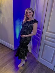Wore this as a wedding guest at 17 weeks pregnant and got tons of compliments! The 6 was a little snug but it made my bump look cuter lol so I wore it even though the 8 fit better overall. The sequins add such a glam element but the material is still very stretchy and soft. The only con was the slip underlayer was riding up all night--you can't tell visually but I could feel it. Would rent again whether pregnant or not!