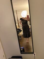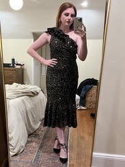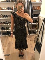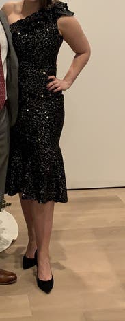 I wore my dress for a ball/charity event that was 1920s themed #allthatjazz and it was perfect. I received lots of compliments! The Shoshanna dress was so comfortable yet glamorous! It's soft velvet with lots of gold"ish" sequins! The dress has a little give to it which is nice. It is fun and flirty! Loved loved loved it!
