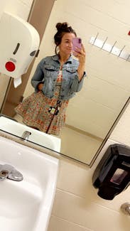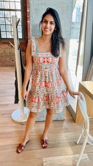 I liked this more than I thought I would. The color combos aren't my most flattering but the print, details, and design were actually pretty great. Don't love tie/knot shoulders but it was fine. Did not feel too short on me and didn't have to wear a bra! Looked great with a jean jacket over top and think would look nice with some suede boots when it gets cooler.