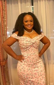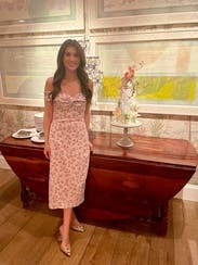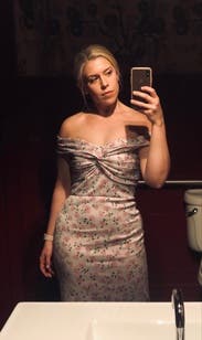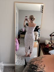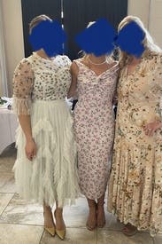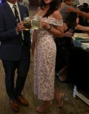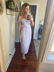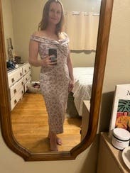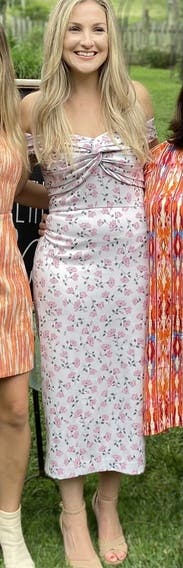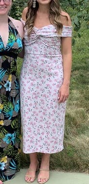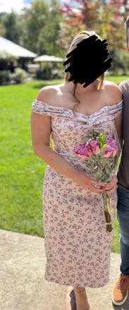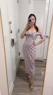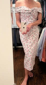 Loved this! Rented for my bridal shower brunch, and loved how elegant and classy it looked. I'm big on florals anyway, but this pattern was even prettier in person. Comfortable and easy to wear, too. There's support up top, so I didn't need a bra, and the off-the-shoulder straps stayed in place surprisingly well. The fabric isn't stretchy, but definitely didn't wrinkle, so it photographs nicely. I'm a size 6 with a small torso and larger hips, and maybe could have gone down to a 4, because it was a tiny bit roomy in the hips/waist. I worried that the midi length wouldn't be flattering, but it worked perfectly with heels (I'm 5'8'').