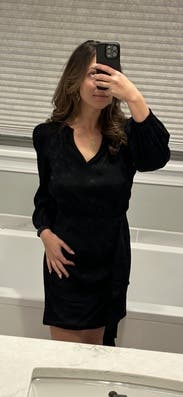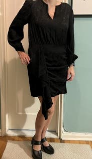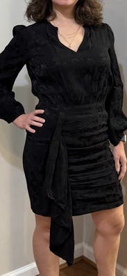 So flattering and easy to wear. I wasn't sure how the long hanging material would be but it was a really fun detail. The rouging in the midsection is a game changer for me, I liked the length and the long sleeves were perfect for evening. And it is lined well in the skirt area which I appreciate. Overall a great, well made and fitted dress!