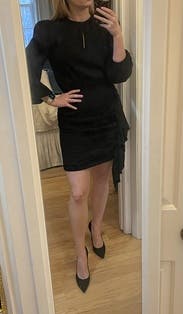 This black dress has a sleek, sexy vibe without being over the top. It’s very flattering and comfortable, with a fit that smooths in all the right places. Easy to wear and feel good in.