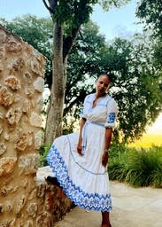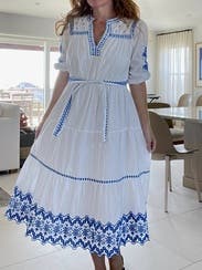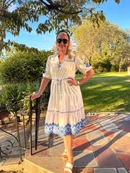 Pretty embroidered details and can’t go wrong with blue and white. Comfortable and easy to wear.