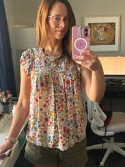 I love the delicate floral pattern! I tucked it into a skirt, but it could be left un-tucked and still look nice. It needed ironing before wearing. Soft and easy to wear.