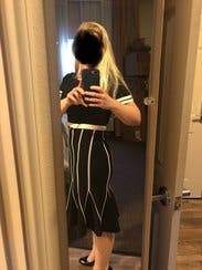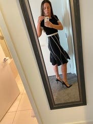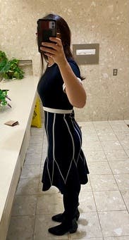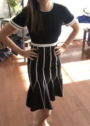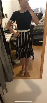 I rented this for a big presentation. It's a gorgeous fit, thick stretchy material with a little flirt at the hem. One of my favorites!