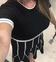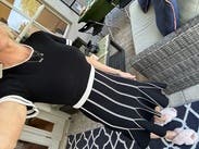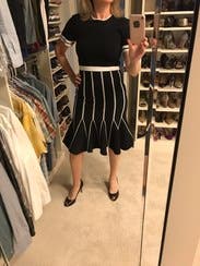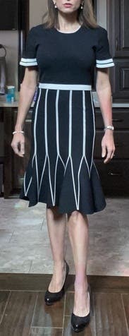 Length is great for work. The bottom adds a little fun to the black dress. White lines on skirt are flattering. No zipper so hard to take on and off with make up and deodorant but other than that it's a great dress!!