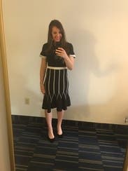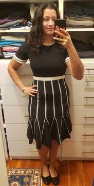 Very cute dress, perfect for work, but it was hard to put on and tight, showing all the bumps. I'll try again in a large.