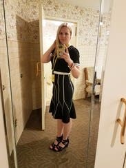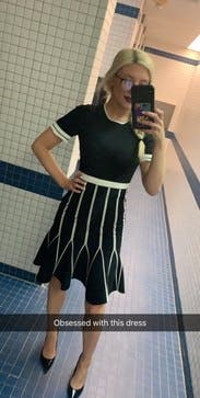 I was excited to be the first person to wear this dress, tags were still on it. So, I feel the need to give a good review, sorry the pic isn't great. I loved this dress, very cute and I received several compliments. I ordered a S, I normally wear a 4-6 and I may have been a little more comfortable in a M. The knit material hugs the body and it has great stretch, but if you're body conscious you may want to wear shaping undergarments, but it is thick enough to hides lumps and bumps. You can wear a normal bra. I wore this to work and then to an event after work. I would recommend renting this dress, it's sweet, sexy, sassy, fun, flirty and feminine all rolled into one!