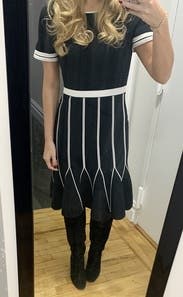 Loved this dress, thick material so hides any bumps but highlights curves. Fall / winter dress. Flattering and flirty.