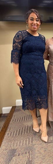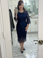 I normally wear a 6 and the 6 fit perfectly. The fabric felt like good quality. I wore a black strapless bra and paired my Stuart Weitzman nude heels and Rebecca Minkoff light blue leo clutch. I received numerous compliments throughout the evening. My backup size was a 4 —which I could fit into but the arms would have been too tight to lift over my head. I loved the lace detail on the sleeves. The color is a true navy blue.
