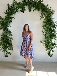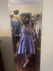 The backup size for my original selection was unavailable and I got to pick a bonus dress from what was available last minute so I chose this as a wild card dress. I wore it to a bar mitzvah and I stood out in a sea of black dresses! The blue metallic lining is such a fun detail and it matches the blue flowers. The bodice has an internal support you can hook to keep everything secure, and the zipper and boning make the waistline look really flattering. And it has pockets! I’m glad I took a chance on this dress because I had a blast dancing all night in it!