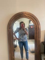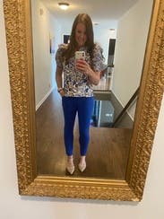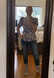 This shirt surprised me and I liked it much more on than I anticipated. Beautiful print and exciting sleeves. Also immediately received multiple compliments. I paired it with a pair of boyfriend jeans for a polished, yet casual look. Great for WFH b/c it's very comfortable and the fabric is thick as well as elastic, so it retains it's shape very well.