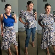 I love a good set, and this Shoshana duet is fabulous! Great, thicker cotton spandex and details. The arms a little tight, size up if you have larger arms. It would be so cute with jeans come fall, too. Very well made and the pattern has royal blue, peach, white, and light pink it in so you could even pair it with light pink jeans. Get the skirt, too, if you love this top -- it Klingsmith looks like a dress and they both pair great with other items. Would rent again!!