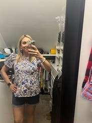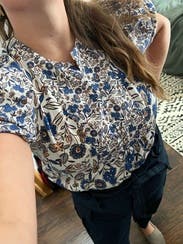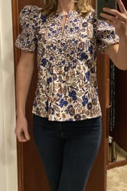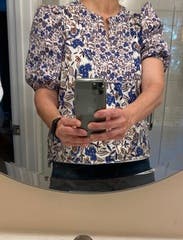 Cute top I wore for a work presentation. Pattern is nice and the puff sleeve is on trend. Runs a bit small so size up if between sizes or if you have wide shoulders.