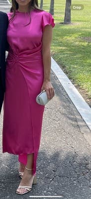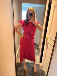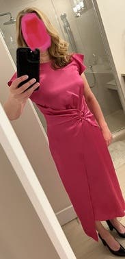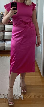 Such a pretty dress. I wore it to 2 weddings. It fit me perfectly and I liked that I could wear flats with it. Having the little sash over the stomach was great in that I could eat whatever I wanted without worrying about having to suck my stomach in. The color is stunning! The perfect pink!