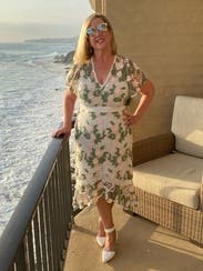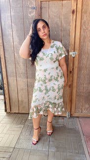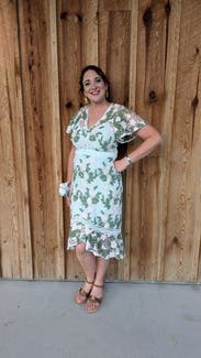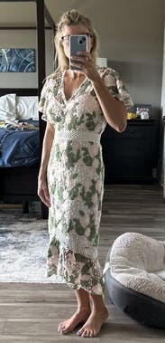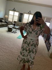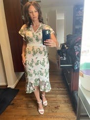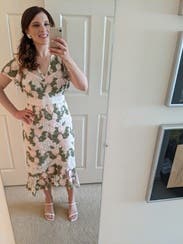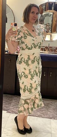 I had my eye on this piece for a long time, just waiting for the right occasion. I wore it to a wedding that was outside and it was perfect. Excuse the dog bed and bare feet on photo, (I also didn’t have it zipped all the way) - I wore a pair of pale pink pumps to complete the look. At first I was concerned about the length hitting me at an unflattering point (midi lengths don’t look good on me), but this actually worked out quite well! I felt very feminine and age appropriate. It was a tiny bit roomy, but that was nice so I could have cake and dance comfortably! Received a lot of compliments on this one.