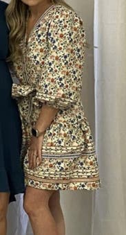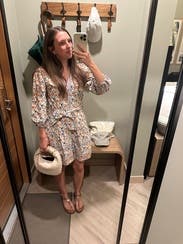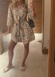 Wore for Mother’s Day 💞 got so many compliments! Im usually a size 4 but decided to size up, glad I did! I’m 5’2 and fluctuating between 135/140 in weight so the 6 was good. I can say that it was a little shorter than what I expected, but definitely doable with shorts under. Loved the colors on this! Def going to rent again 🥰