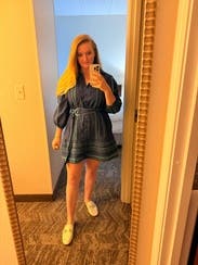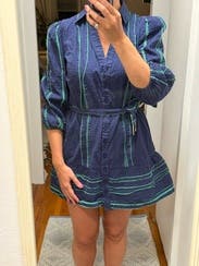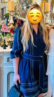 Cute spring dress. Length works well for shorter. First button is low so you will want an undershirt or pin if you like it more modest. I felt it was quite big/roomy, which was remedied with the belt, but I could have easily sized down. I wished the belt was a tie vs the silver buckle but still overall very cute.