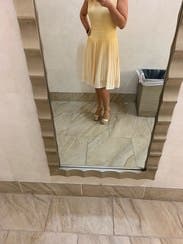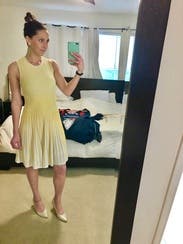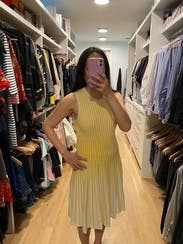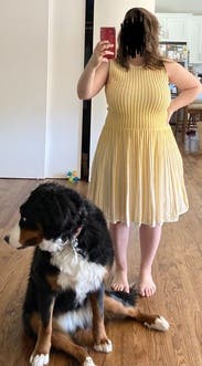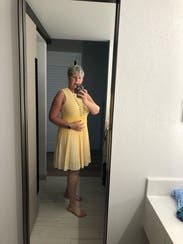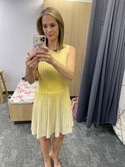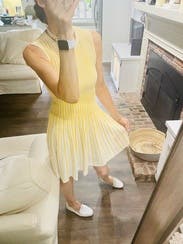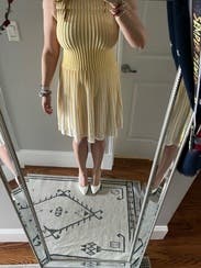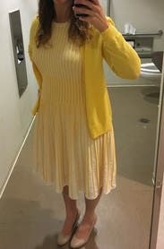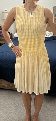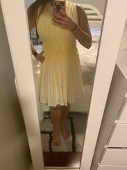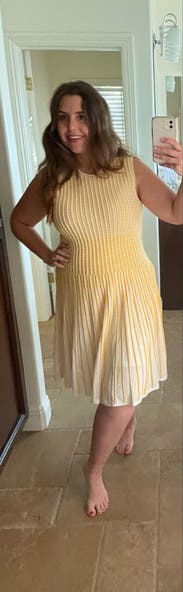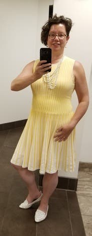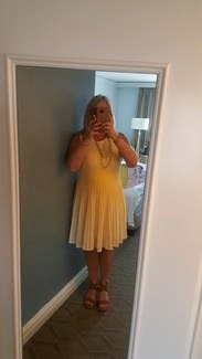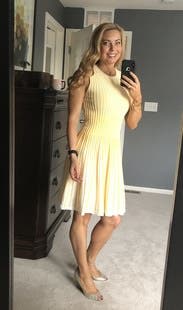 Many compliments! This shade of yellow is great for blondes! Figure flattering, not too clingy, swingy feminine skirt. Perfect for a sunny summer day. I could probably have gone into an xs, but I didn't want it to be too tight up top.