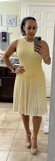 I love this dress! I think the style is so cute. I didn't expect to like a drop waist on my figure (5'3", petite, and pear shaped), but I thought this was surprisingly flattering! The drop waist hits in a way that, for me, hid any lumps/bumps and flattered my belly. I think the yellow stripes are adorable and summery. I've been enjoying the knit dresses from this brand. The fabric is a heavy weight, but not too heavy - still light and breathable, but it feels substantial. The fabric does bounce and move as you walk, and it's not super soft so that can be a little annoying, but nothing a slip couldn't fix. I got lots of compliments when I wore this to work on a sunny summer day. I think it would transition well to date night or the weekend.