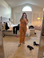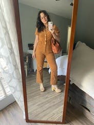 Tan corduroy puts a fall spin on this Show Me Your Mumu jumpsuit. Pair it with a brimmed hat and long walks through apple orchards.