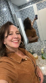It’s hard for me to wear a romper because I have a long torso. So there’s a tiny bit of writing up in the crotch, but there’s enough stretch that it fits well. I wore it with a belt to cinch the waist, bc I have a booty. Without a belt, it’s not a form fitting.
