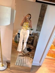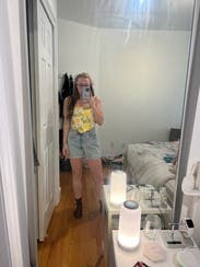 I didn't end up wearing this top, it was too short and the material was thick and awkward. The bottom of the shirt was constantly folding up and didn't sit right. It looked a little too young to wear for me.