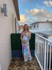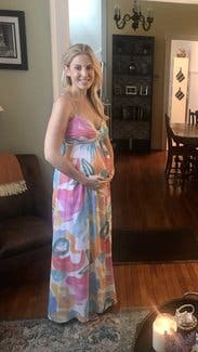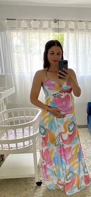 This dress was so fun to wear on vacation. Sized up per other reviews and was happy I did. Fit me at 29 weeks and got so many compliments. Loved it and wish I had more places to wear it!!