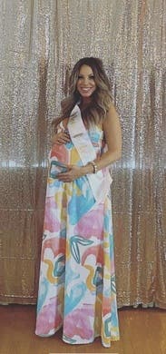 I wore this for my baby shower at 31 weeks pregnant. I absolutely loved it! The dress was comfortable and the colors are vibrant and fun. I’m usually a small/medium and size 6 pre pregnancy. I got the medium and large. I ended up wearing the large because the medium was way too small around my bust.