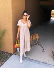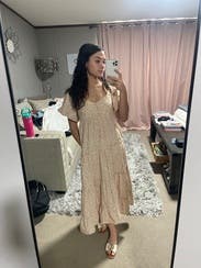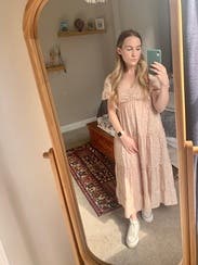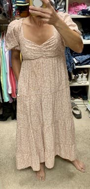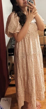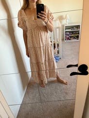 I love everything about this dress. The puff shelve was so cute and gave cottage core vibes. The length was perfect to dress down with sneakers or up with a heeled sandal. The smocked back was very comfortable for my 36 DD chest. Ordered my usual size of a medium which worked great with my bump, i wore between 23-25 weeks pregnant