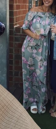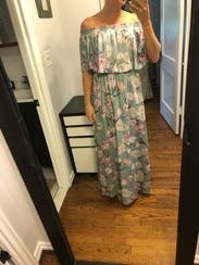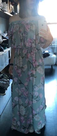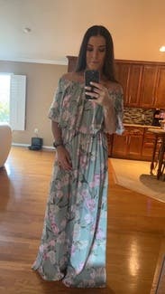 I’m 4 months pregnant so I was nervous to find something comfortable but not frumpy. The material was silky, it flowed when I walked, slits on the sides gave it a little flair and my husband said it was sexy having my shoulders out. In fact he asked me how much it would be to buy! It was perfect.