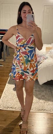 Cute dress! Loved the colors and super lightweight material, wore to a bachelorette nice dinner out in Miami. Pretty short, I'm 5'4 and it was a little above mid-thigh. Good support with the wrap for boobs too, I wore a strapless bra with for extra support (I'm DD). Would def rent again for summer parties