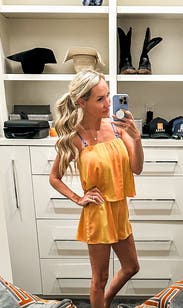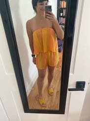 Great fit! Super comfortable and easy! Loved this romper and wore it multiple times. So cute with yellow shoes and Rent The Runway Bag.