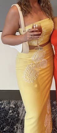 I got so many compliments on this set. I went with a size 12 top but should’ve done a 10 because it was a bit loose on me, but the skirt was a size 6 and fit perfect. Take material felt very luxurious wearing it but also casual enough to go barhopping.