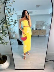 This set is perfect for summer or vacation! It's bright and such a standout. I received so many compliments! A lot of reviews said it ran small so I sized up but honestly could've stuck with my regular size (especially since I have a smaller chest). I did wear a strapless bra with it and had to pull it up a couple times throughout the night but didn't really bother me! Highly recommend!