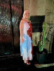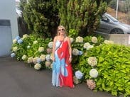 The perfect tropical dress! Amazing colors & pattern. Great length with a small heel. Received compliments galore. Flowy but no slit means safe with wind.