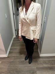 Such a nicely made blazer and a beautiful blush color. The asymmetrical hem gives a neutral look some pizazz. Fits TTS