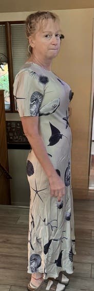 I was a bit worried this silk dress wouldn’t fit or move with me but it was so comfy and silky. The color is like a sand color which didn’t wash me out and the design was so cute. Got lots of compliments.