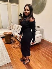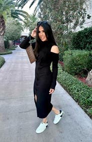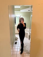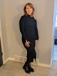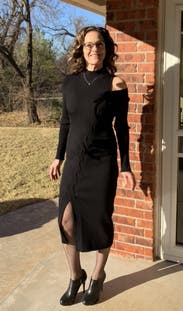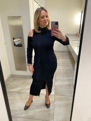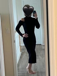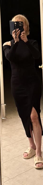 Loved this sweater dress, runs true to size and material is nice and thick. Slit and shoulder cut out give it a little edge! Can dress up or down.