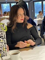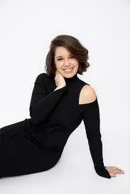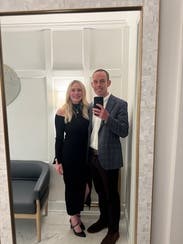 I think you should size down forsure, if you want it to be form fitting. The material is lovely and the shoulder cut out was perfect. The slit wasn’t too high, felt professional and elegant.