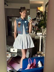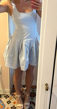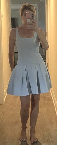 super cute but size down!! I decided to wear it with a cropped cardigan because the sides of the dress by the arm holes were too big.