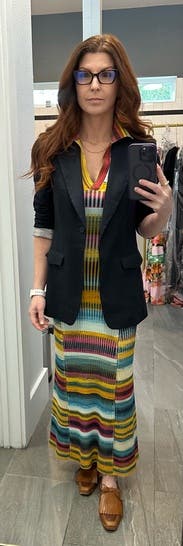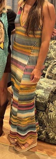 I wore this in Mexico City for dinner. It fit like a glove and was sexy yet comfy. The colors are so fun and the pattern of the weave is so flattering. It’s oddly very a very heavy thick knit but I did not feel warm in it. Was comfortable in 75 degree weather.