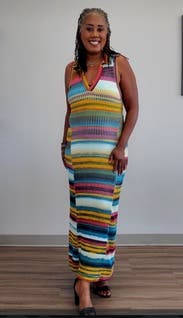 Multicolor stripe knit (90% Rayon, 9% Nylon, 1% Spandex). Sweater sheath. Sleeveless. V-neck. Pull on. 50" from shoulder to hemline. Imported.