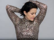 The shirt is stretchy without being tight. Easy to wear. Other reviews say it's an "obvious leopard print" which it is but it's not over the top and I might not have even known without reading it. As far as sequins go it's not scratchy at all. Rent it. You won't regret it.