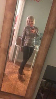 I loved this top! It has a layer underneath so you aren’t feeling the sequence. It is tight so after reading the reviews I did size up, glad I did.
