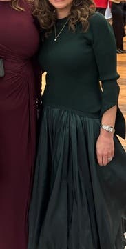 This dress is elegant and edgy, the dark green color was perfect for holiday and winter events, and the bubble hem taffeta skirt gives ball gown vibes without the length. The sleeve slit, fitted top, everything about it is a dream. I wore it 4 times and I usually only wear my rentals once or twice.