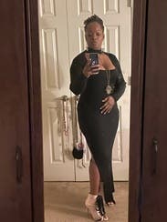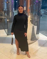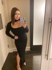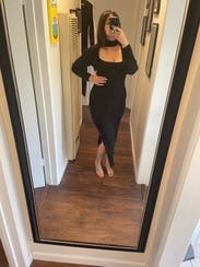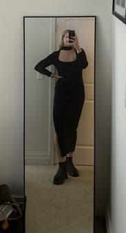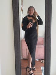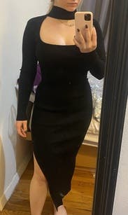 I felt so sexy/sophisticated in this dress. I love the choker with open cleavage and the length of the sleeves and the skirt with the slit up the side, really hot. Material is thick, stretchy, form-fitting but forgiving, and so comfortable. Looked great from all angles, really showed off all the squats I’ve been doing too. lol. Only downside was my bra was peeking out from time to time, but I’d just wear a strapless next time. I’m considering buying it.