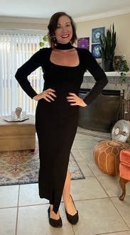 This is a beautiful and comfy, black dress! Only minor con is the way the keyhole droops, Wearing a bra that doesn't peak out of it was a bit of a challenge, but loved it anyway!
