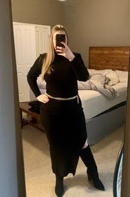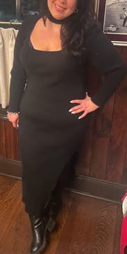 Got lots and lots of compliments on this at a winter wedding! Was fitted but still super comfortable with the sweater material. The neck scoops very low so I wore a bandeau-style sticky bra and it worked well.