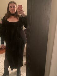 This dress was very warm and thick. Which was great because it was 10 degrees out when I wore it. But it did start to get hot when I started dancing. It’s flattering and shows shape without being super tight. I’m bigger in the hips and smaller in the bust. There was a little room up top but not so much it was baggy. Bustier ladies would have room. I managed to wear a bra without the straps showing but could be because of my smaller bust.